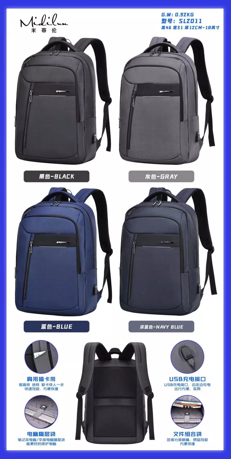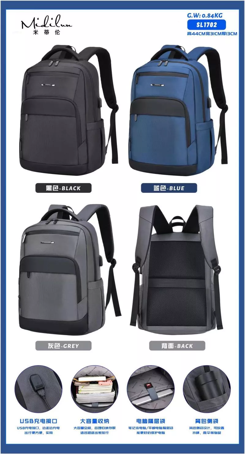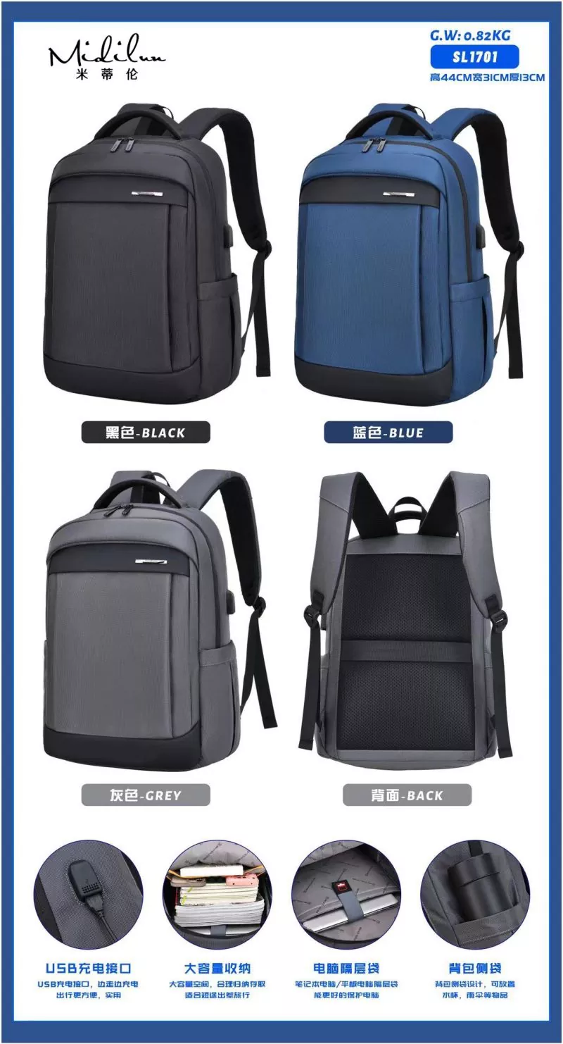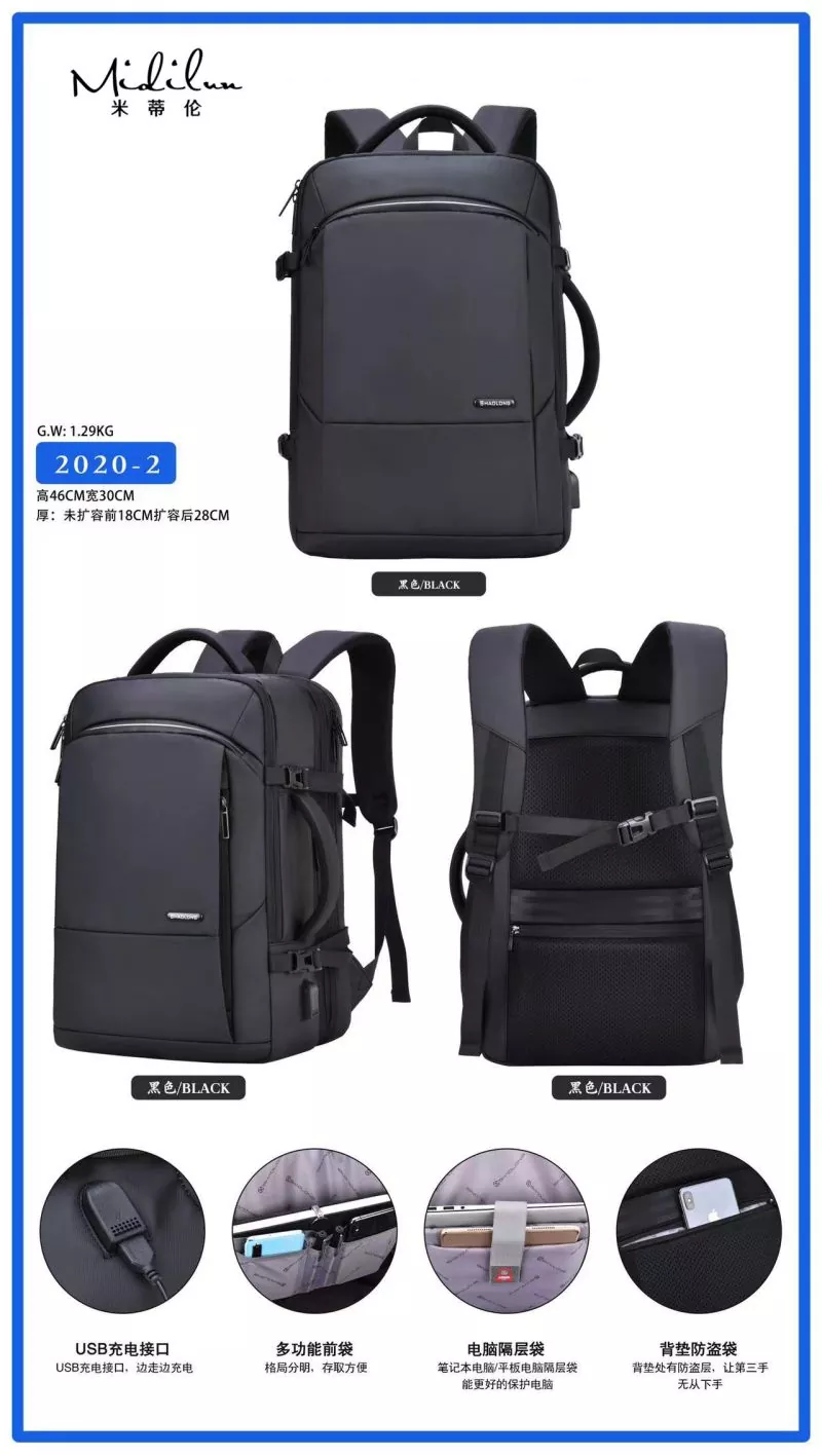 Business Backbag Manufacturers має персоналізований діловий стиль, щоденні поїздки, їх можна носити пліч-о-пліч, проривний, молодий, відповідальний, легкий у дорозі, жити самому, міський стиль, стильний і легкий у подорожі. Бізнес-рюкзак Midilun має більш зручний і практичний дизайн, має задній ремінь, який можна використовувати з чохлом-візком. Він оснащений ремінцем для візка для більшої зручності, стільниковою подушкою для спини для комфорту та повітропроникності та прихованою сумкою проти крадіжки ззаду. 3D-дихаюча губка, наукове зменшення ваги, зручне та легке носіння, лише тоді воно матиме стильний зовнішній вигляд. Сумка Midilun Business Backbag Suppliers розроблена зі зручним плечовим ременем, який прилягає до спини, щоб зменшити тиск на спину. Спинна подушка виконана зі стільників, щоб сприяти вільній циркуляції повітря, зберігати спину сухою та ефективно зменшувати потовиділення спини під час виходу за високої температури. Сумка Business Backbag оснащена зовнішнім інтерфейсом зарядки, що дозволяє заряджати та грати під час подорожі. Інноваційний дизайн включає кабель для передачі даних для внутрішнього заряджання та зовнішній інтерфейс для заряджання, що полегшує заряджання під час далеких поїздок. Ваш телефон може продовжувати працювати, поки вас немає.