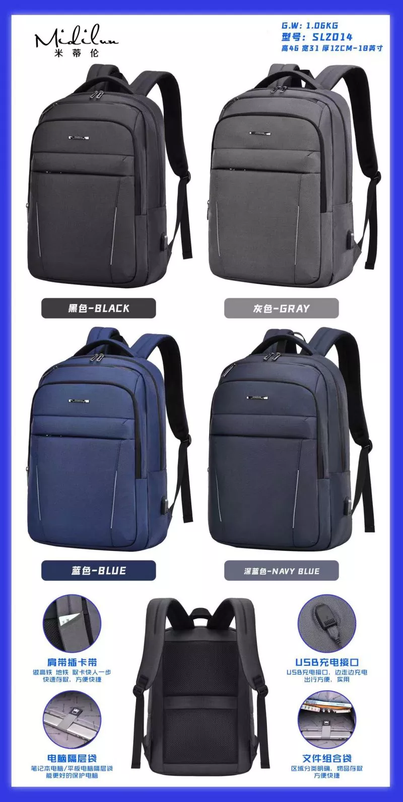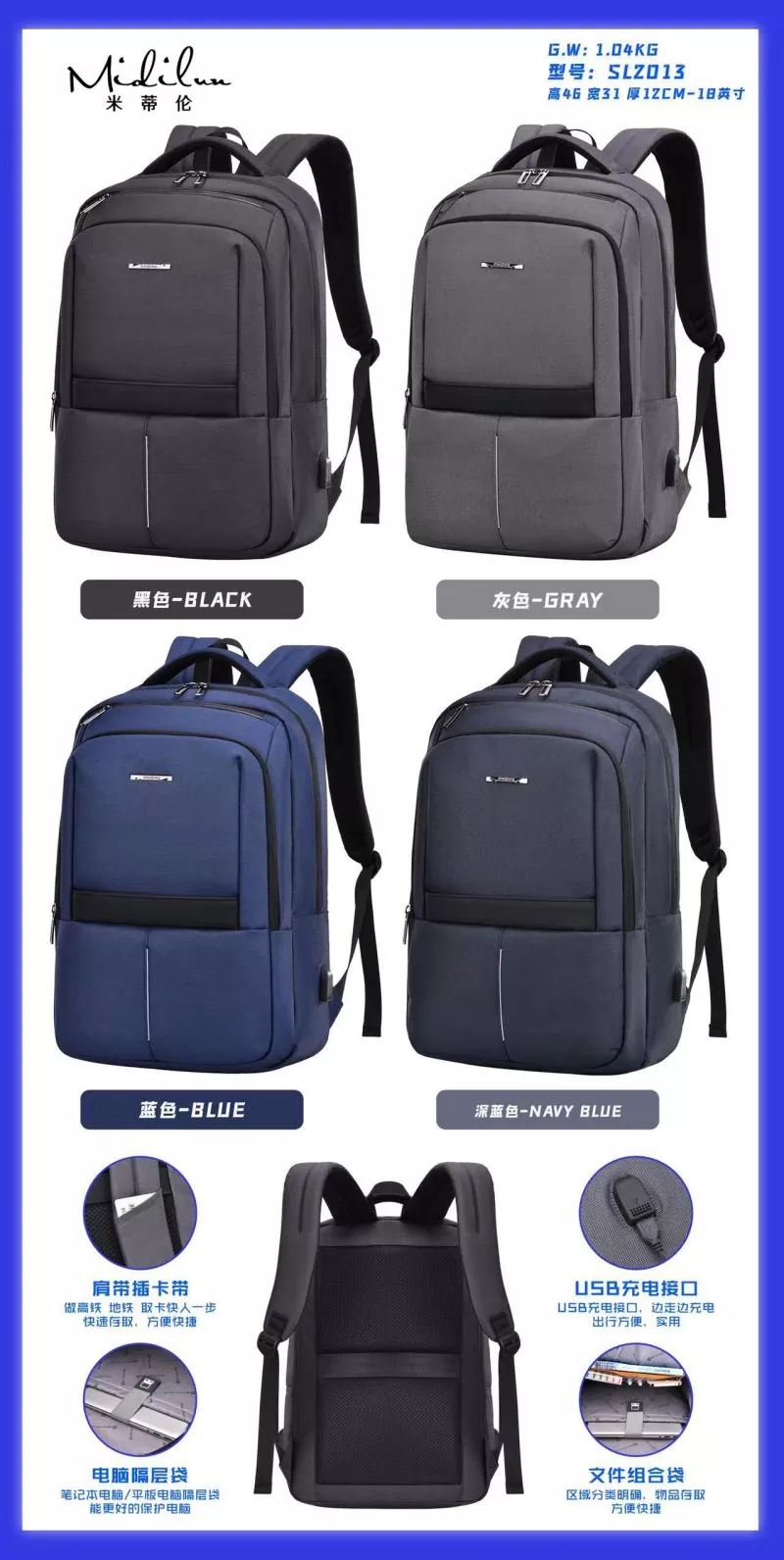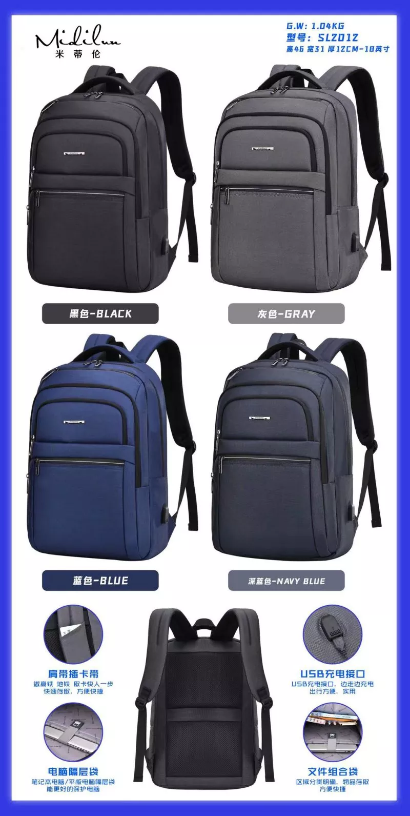 Business Backbag Manufacturers має персоналізований діловий стиль, щоденні поїздки, їх можна носити пліч-о-пліч, проривний, молодий, відповідальний, легкий у дорозі, жити самому, міський стиль, стильний і легкий у подорожі. Бізнес-рюкзак Midilun має більш зручний і практичний дизайн, має задній ремінь, який можна використовувати з чохлом-візком. Він оснащений ремінцем для візка для більшої зручності, стільниковою подушкою для спини для комфорту та повітропроникності та прихованою сумкою проти крадіжки ззаду. 3D-дихаюча губка, наукове зменшення ваги, зручне та легке носіння, лише тоді воно матиме стильний зовнішній вигляд. Сумка Midilun Business Backbag Suppliers розроблена зі зручним плечовим ременем, який прилягає до спини, щоб зменшити тиск на спину. Спинна подушка виконана зі стільників, щоб сприяти вільній циркуляції повітря, зберігати спину сухою та ефективно зменшувати потовиділення спини під час виходу за високої температури. Сумка Business Backbag оснащена зовнішнім інтерфейсом зарядки, що дозволяє заряджати та грати під час подорожі. Інноваційний дизайн включає кабель для передачі даних для внутрішнього заряджання та зовнішній інтерфейс для заряджання, що полегшує заряджання під час далеких поїздок. Ваш телефон може продовжувати працювати, поки вас немає.